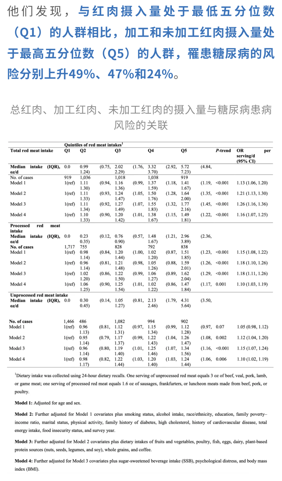 这项研究表明,那些我们爱不释口的猪肉、牛肉和羊肉等红肉,可能正在推高2型糖尿病的风险。与红肉摄入量处于最低五分位数(Q1)的人群相比,总红肉、加工红肉(如火腿、香肠、腊肉等)和未加工红肉(牛肉、猪肉、羊肉等)摄入量处于最高五分位数(Q5)的人群,罹患糖尿病的风险分别上升49%、47%和24%。