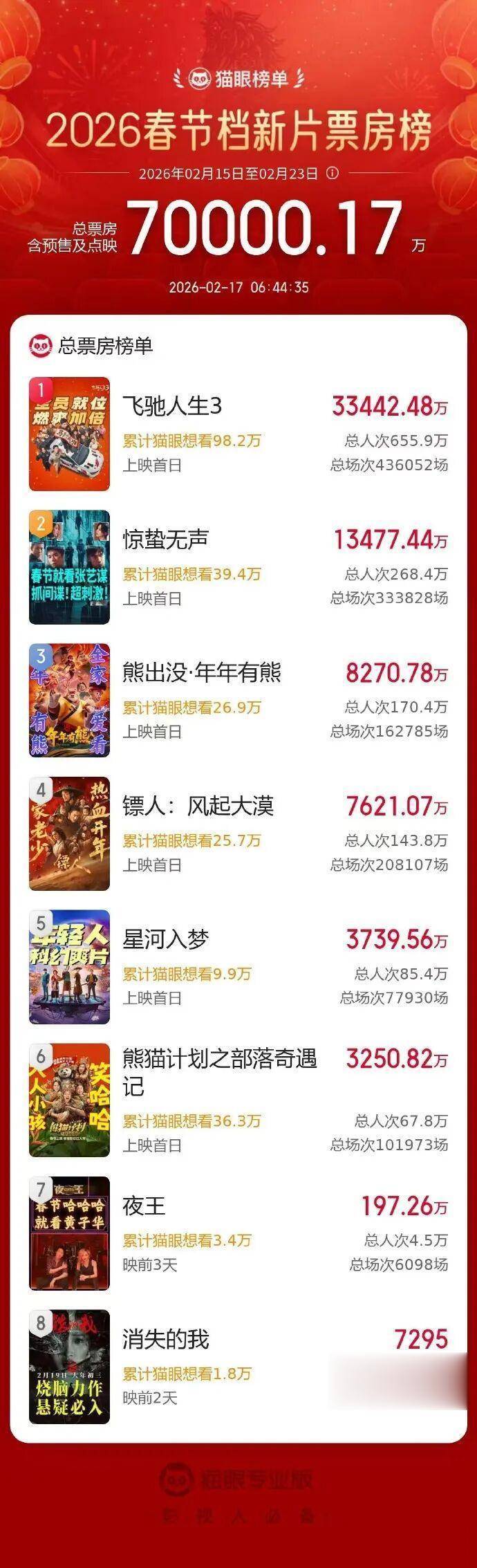 据1905电影网援引网络平台数据,2026年春节档档期总票房破7亿(总票房含预售及点映)。平台最新数据显示:2月17日大年初一,《飞驰人生3》持续领跑,《惊蛰无声》《熊出没·年年有熊》分列二三。